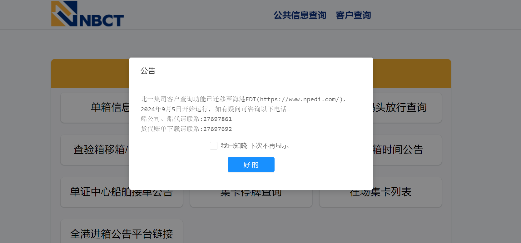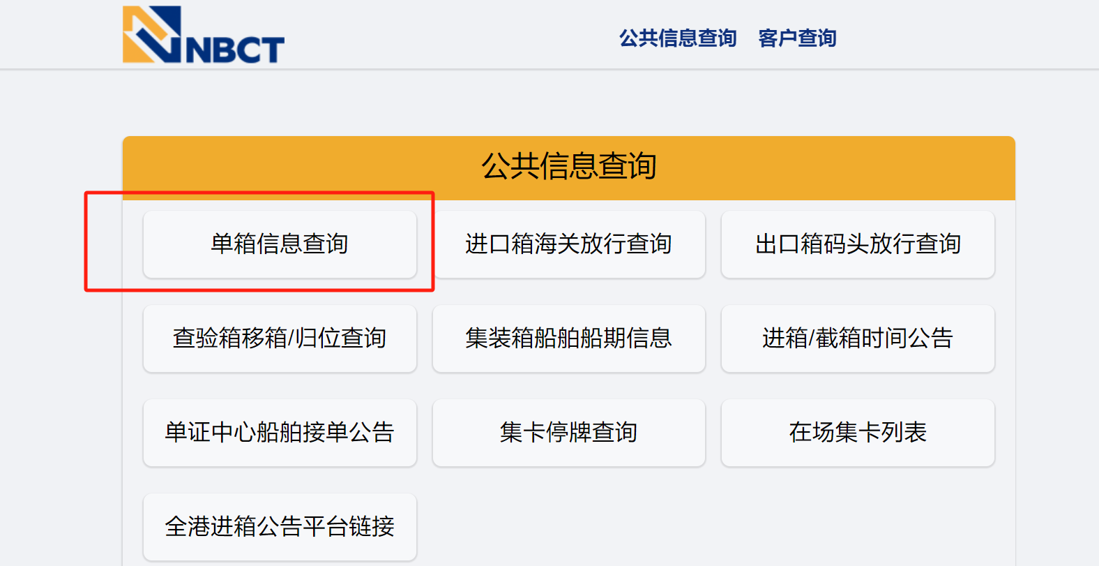 比如说查询宁波二期码头(北一集司)码头放行情况,可以登录北一集司的官网查询:找到单箱信息查询,输入箱单号/提单号。